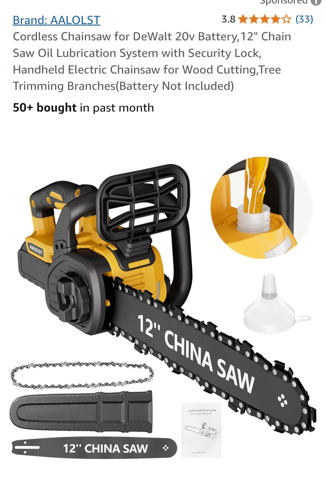 Introducing the Retail $120 Corless Chainsaw! With its cordless design, this chainsaw allows for ultimate convenience and portability. It is compatible with 20v Dewalt batteries (batteries not included) for reliable and powerful cutting. A must-have for any avid gardener or outdoor enthusiast.