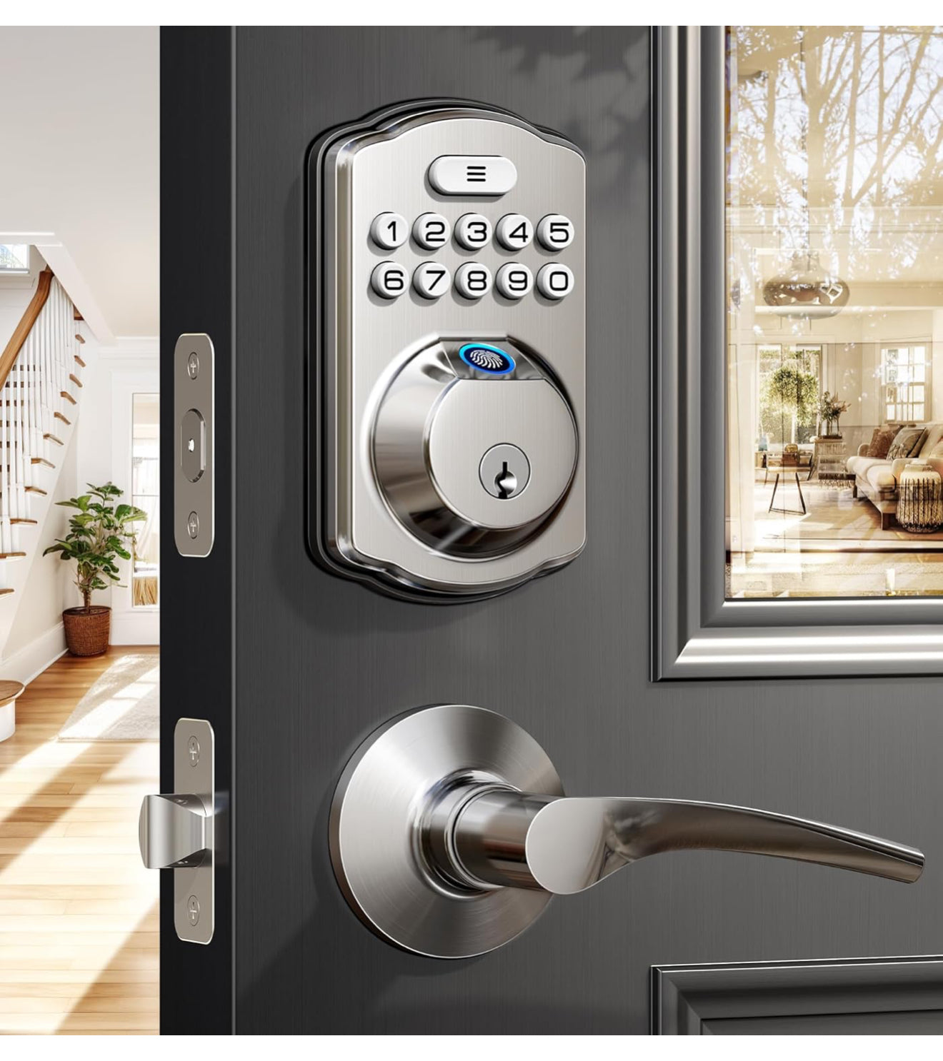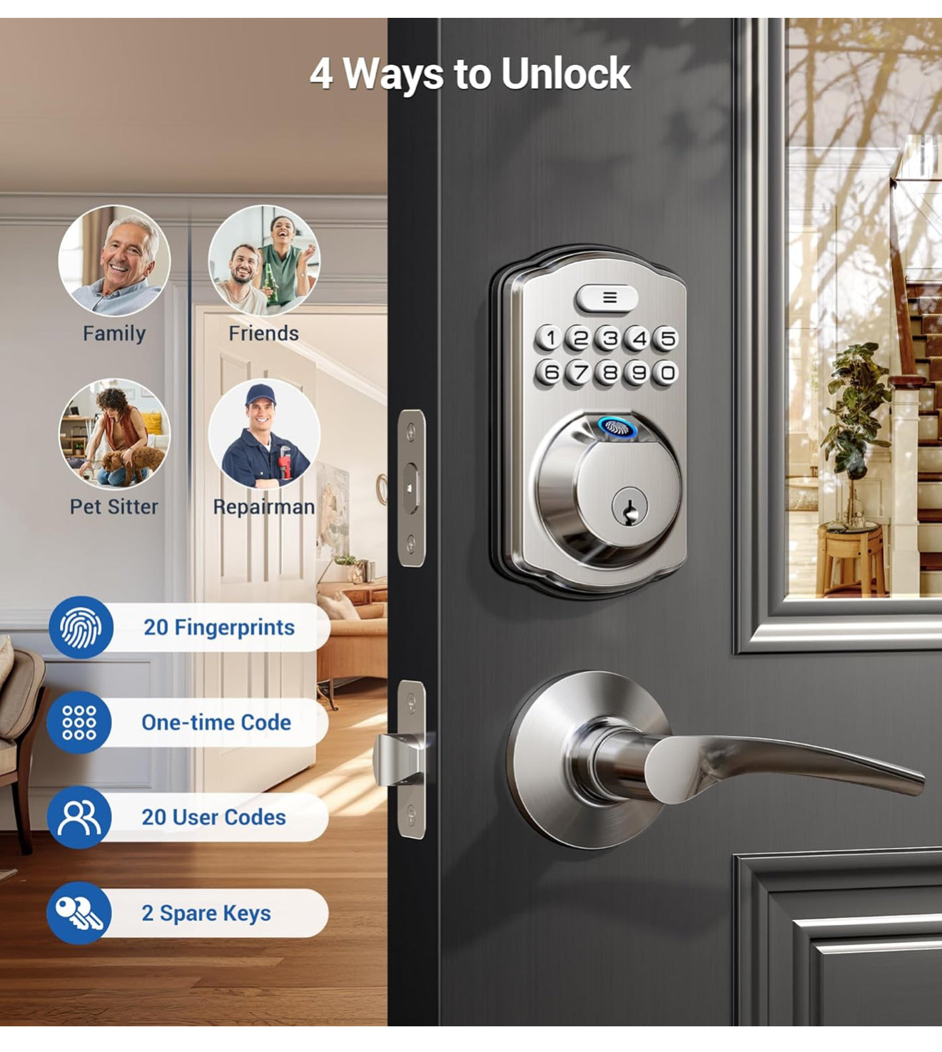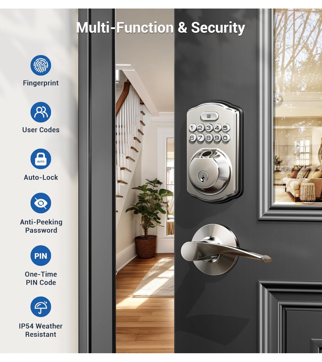 Veise Fingerprint Door Lock with 2 Lever Handles - Keyless Entry Door Lock, Electronic Keypad Deadbolt, Digital Smart Code & Front Handle Sets, Auto-Locking, Easy Installation, Satin Nickel